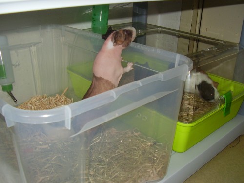 Morčíci v naší CHS bydlí většinou v plastboxech, jen pokud máme vysokobřezí samičky,samičky s mláďaty, nebo málo místa, když jdou malí odchovanci do puberty, bydlí někteří v tzv. porodnicích, jak já jim říkám, je to ta levnější varianta bydlení, ale u nás je to pouze přechodné bydlení, neboť je prostorově nevyhovující, je tak jen na jednoho dospělého morčíka. Fotografie jsem sice kdysi uveřejnila v novinkách, ale je mi jasné, že nemůžete tušit, že jsem to tam před několika měsíci uveřejnila. Takže představuji bydlení našich spokojených morčáků - skinníků a jedné genovečky ... jsou to tak mnou prosazované plastboxy, do kterých, pokud jsou dál od okna a větráte, tolik na skinníky netáhne a nevypadávají z nich hobliny a to hospodyňky docela ocení:o)